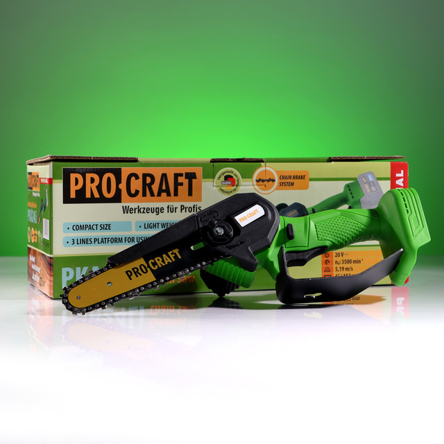 Procraft PKA24Li — компактна акумуляторна міні-пила, створена для обрізки дерев, догляду за садом та точної роботи з деревиною. Вона оснащена щітковим двигуном, працює від акумулятора 20 В та розвиває швидкість обертання ланцюга до 5,19 м/с. Завдяки шині довжиною 15,2 см, пила ідеально підходить для маневрування у важкодоступних місцях. Надійна, зручна та автономна — чудовий вибір для дому та професійного використання.
